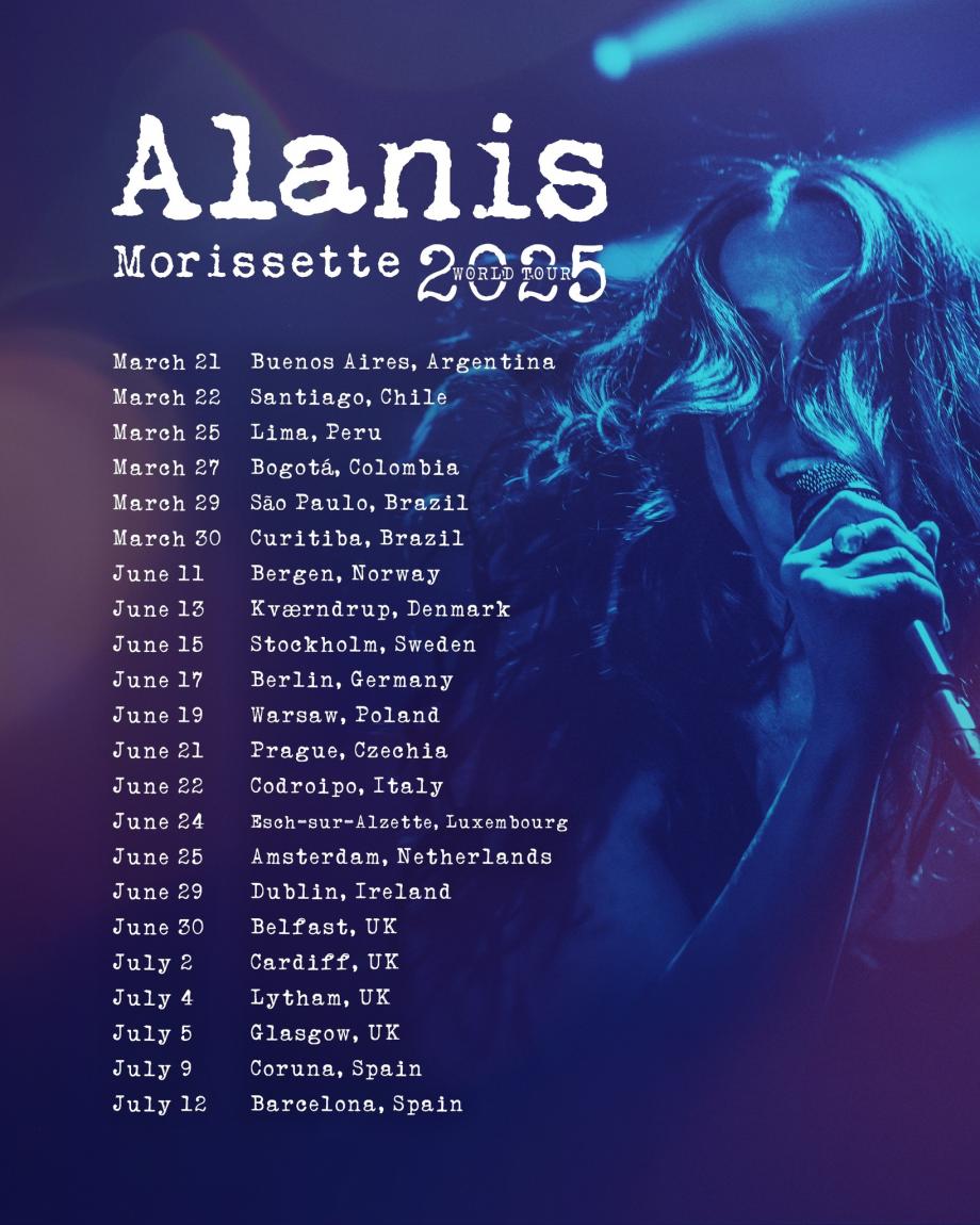 Носителка на седем награди Grammy, мултиплатинената изпълнителка и автор на песни Alanis Morissette обяви подробности и 16 нови дати, част от световно турне следващото лято. Общият брой на концертите към момента е 22, като стартират от Буенос Айрес на 21 март, но ние се фокусираме върху по-достъпните до нас – тези във Великобритания и Европа, които ще започнат от Бергенфест, Норвегия на 11 юни. Оттам тя планира да поеме към Дания, Швеция, Германия, Полша, Чехия, Италия, Люксембург и Нидерландия. Предвидени са и пет концерта в Обединеното кралство и Ирландия, които стартират с шоу в Дъблин на 29 юни, последвано от спирка в Белфаст на следващия ден (30 юни). Останалите включват Кардиф, Лидъм Сейнт Анс (Ла̀нкашър) и Глазгоу съответно на 2, 4 и 5 юли. Следват две шоута в Испания, които ще се проведат в Ла Коруня и Барселона. Вижте постера с всички дати по-долу, като Alanis обещава да добави още.