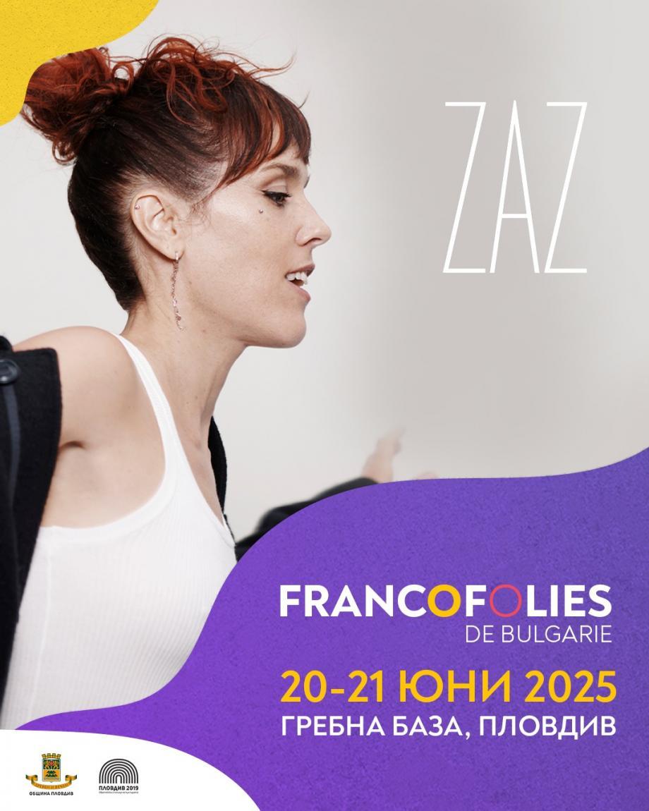 Френската колоритна певица ZAZ ще бъде отново в България това лято. Тя е първото голямо име, което обявяват организаторите, в тазгодишното издание на фестивала ФРАНКОФОЛИ. Известна със своя уникален глас и стил, тя ще изнесе голям концерт на открито на специално изградена сцена на гребната база в Пловдив.