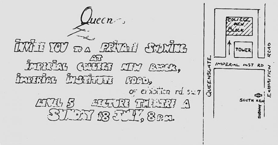 Брайън Мей споделя, че е бил член на Комитета за забавление, когато е бил студент и е бил свидетел на някои големи музикални актове. "Хиляда души купиха билети, за да видят Джими Хендрикс и няколко години след това свирихме в същата зала, което беше голяма тръпка за нас. Това беше празник", споделя той. Ето и как е изглеждала поканата за събитието: